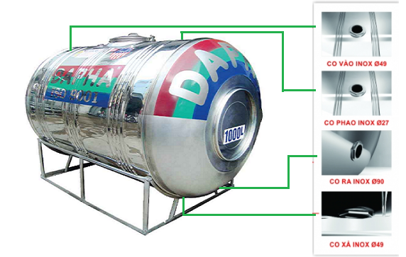 Bồn chứa nước inox hiệu Dapha là một trong những thương hiệu nổi tiếng trong ngành bồn nước của nước ta. Nhà cung cấp sản phẩm bồn nước uy tín, chất lượng, và có dòng sản phẩm đạt tiêu chuẩn xuất khẩu sang Hoa Kỳ. Với chất liệu là inox SUS 304 là nguyên liệu làm thành bồn nước có tính chất dẻo, sáng bóng và khả năng chống chịu ăn mòn cao. Trên các thân bồn chứa nhà sản xuất đã khoan các lỗ của phao, đường nước vào, đường nước ra, xả cặn và gắn co ren trong theo quy cách của từng dung tích bồn. Vì vậy mà khi chọn mua bồn nước chúng ta nên hỏi nhà cung cấp xem các lỗ đó có phi bao nhiêu như 27,34, 49,60… để thuận tiện cho việc mua vật tư lắp đặt. Đó cũng là một trong những cách lắp bồn nước Dapha nhanh chóng, tiết kiệm chi phí và thời gian.